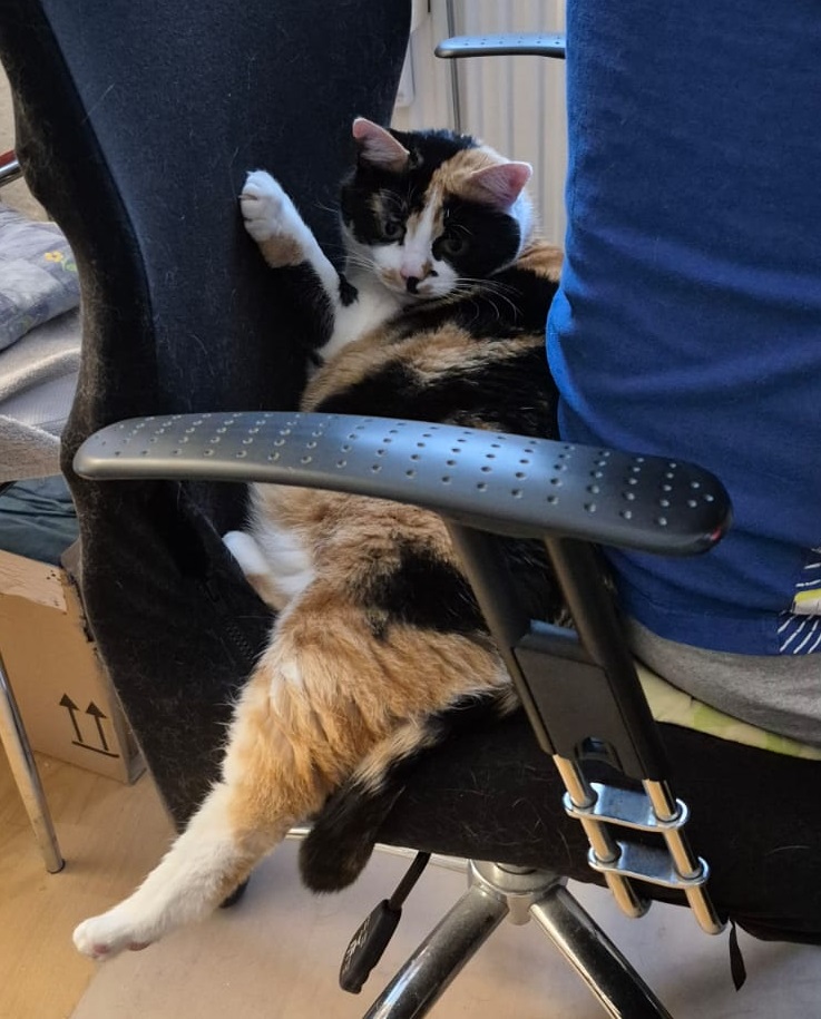 Hier ist unsere bunte Katzendame Fussel. Die hatten wir als Katzenkind auf der Straße aufgelesen, bzw. Kinder trugen sie durch die Gegend, "sie sei ja so süß".