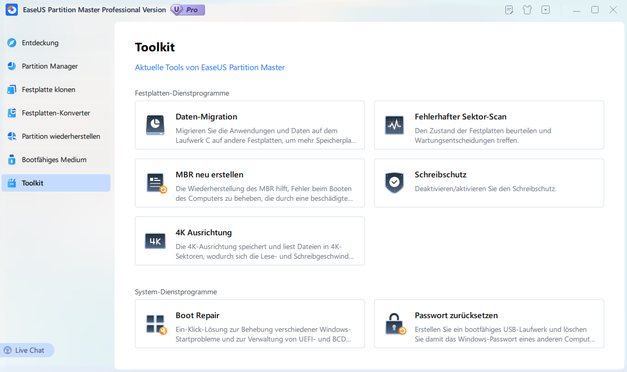 Nach meiner Ansicht das TOP-Tool um Festplatten und SSDs alle Bauarten zu managen. Gerade beim Neueinrichten einer SSD oder Konvertieren/Klonen von HDD auf SSD kommt es hin und wieder zu Problemen. Da ist man froh, das richtige Werkzeug zu besitzen. EaseUS Partition Manager lässt ein Notfallmedium (USB oder CD) erstellen, mit dem man im Notfall booten kann. Aber man kann auch eine Bootpartition auf seinem Computer für den Notfall einrichten. Ich habe beides, also die Notfall-Partition und ein bootfähiges USB-Medium. Wer mehrere SSDs in seinem Computer hat, wird nach einem Update schon mal davon überrascht, dass der Computer nicht mehr bootet. Meist wurde der UEFI-Block überschrieben und/oder auf die falsche SSD geschrieben, im Ergebnis landet man beim Booten in einer Endlosschleife. Da hilft im Toolkit die Funktion Boot Repair mit einem Klick. Für Profies gibt es da einige hilfreiche Zusatzfunktionen. Die Blockausrichtung auf 4 Kilobytes kann die Lese-/Schreibgeschwindigkeit bei SSDs erhöhen, aber da streiten sich die Gemüter, jeder weiß da etwas anderes. Wer Speicher, egal ob HDD oder SSD, konvertieren will, sollte diese vorher klonen/sichern. Prüft aber vorher, ob der Datenträger nicht schon das Dateisystem GPT aufweist! Von MBR zu GPT und zurück funktioniert nur mit anschließendem Formatieren, also totalem Datenverlust. Es handelt sich um total unterschiedliche Datenstrukturen, die NICHT parallel auf einem Datenträger existieren können.