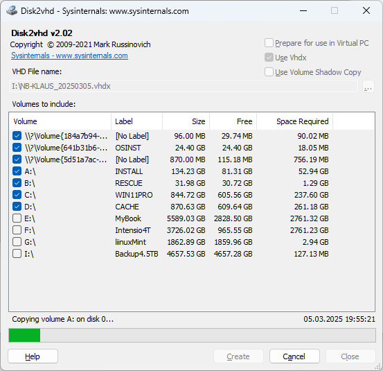 Da fielen viele Softwarehersteller schon gleich zu Beginn weg! Entweder es werden nur Dateien gesichert, die aber Windows von sich aus via OneDrive kostenlos in die Cloud sichert. Wenn man seine Dateien also entsprechend in der Ablage speichert, ist alles zugleich in der Cloud gesichert. Eine sehr smarte Möglichkeit seine persönlichen Daten "unfallfrei" zu doppeln. Sollte man gezwungen sein, seinen Computer neu zu installieren, braucht man nur die Zugangsdaten zu seinem Microsoftkonto, schon kommen die Daten wieder nach und nach aus der Cloud auf den Rechner. Für unsere große Dateiablage habe ich im Kapitel vorher aufgezeigt, was ich nutze. Nun geht es darum, vollständige Festplatten-Images zu erstellen. Dabei möchte ich keine softwarespezifischen Dateien, die im Notfall wieder nur mit spezieller Software geöffnet werden können. Oder die Hersteller sichern die Daten in einem nativen Format, welches sich nicht ohne Hilfsmittel des Herstellers wieder öffnen, bzw. wiederherstellen lässt. Disk2VHD bietet die Sicherung als VHD(x)-Datei (virtuelle Festplatte), welches sich direkt in ein laufendes Betriebssystem (Windows, Linux, Server) einbinden/öffnen lässt. Dazu braucht es seit Windows/Server 2000 kein weiteres Tool mehr, in Linux-Distributionen ist es ebenfalls kein Problem, virtuelle Festplatten zu mounten (einzubinden). Es kann entweder die gesamte Festplatte bzw. Partition zurückgeklont oder einzelne Dateien aus Partitionen gesucht und wiederhergestellt werden. |