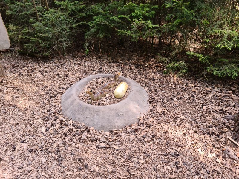 Viele Bäume spenden Schatten und so lässt es sich gut aushalten, zu den lebensecht gestalteten Exponaten sind Infotafeln aufgestellt,