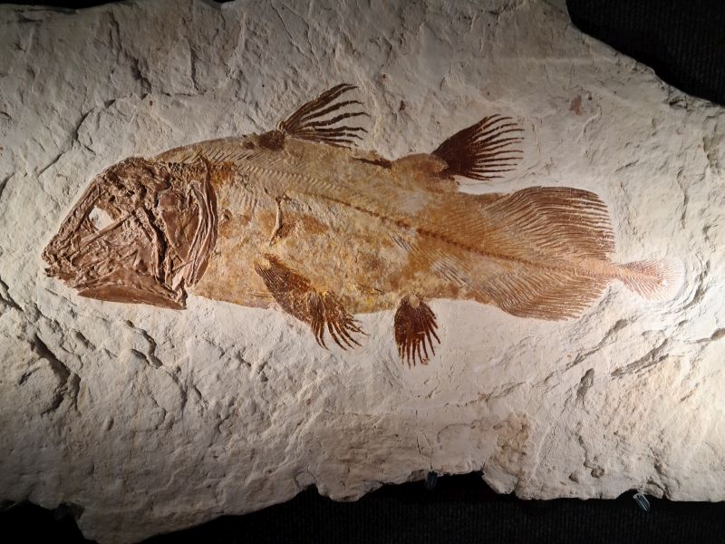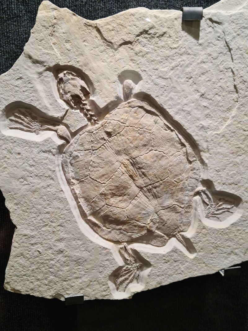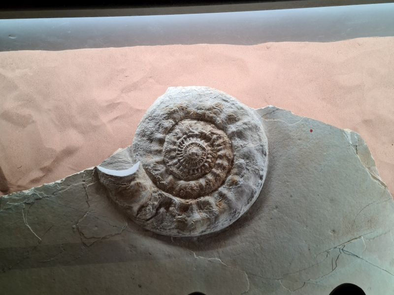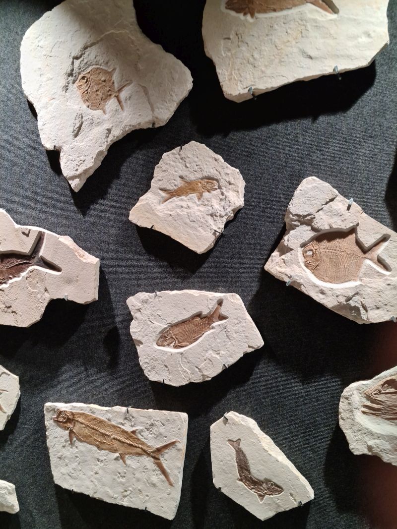 In einer Halle steht ein großes Gerippe und es sind viele Fossilien in Vitrinen ausgestellt.